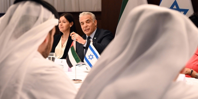 Israeli Prime Minister Yair Lapid meets with UAE Foreign Minister Abdullah bin Zayed in Jerusalem, on September 15, 2022. Photo by Israeli Prime Minister\ apaimages