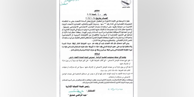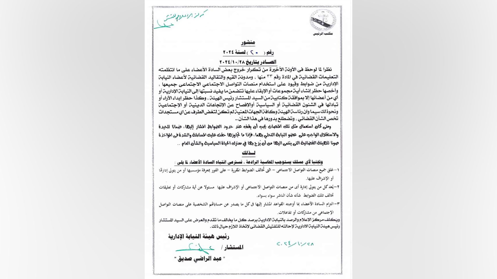 وبحسب المنشور وفقا لموقع “العربي الجديد” عليه، والصادر عصر أمس وتم تعميمه اليوم الثلاثاء، فقد جاء فيه أنه “لوحظ تكرار خروج بعض الأعضاء على ما انتظمته التعليمات القضائية ومدونة القيم والتقاليد القضائية لأعضاء النيابة الإدارية من ضوابط وقيود على استخدام منصات التواصل الاجتماعي جميعها”. وتابع المنشور أن “الهيئة تبدي الآراء أو تبادلها في الشؤون القضائية والسياسية والحديث عن الاتجاهات الدينية والاجتماعية والدخول في معترك السياسة، وهو ما يخرج العضو عن الحيادية والاستقلال الواجب على عضو النيابة التحلي بهما… والمساءلة والشدة في المؤاخذة على العضو صوناً للهيئة القضائية التي ينتمي إليها من أن يزج بها في معترك الحياة السياسية والشأن العام”.