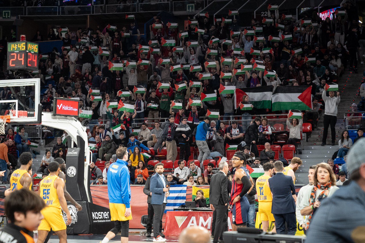 أعرب مشجعو برشلونة لكرة السلة عن تضامنهم مع الفلسطينيين خلال مباراة فريقهم في الدوري الأوروبي ضد نادي مكابي تل أبيب الإسرائيلي، حسبما ذكر موقع «جاستيزبيري» الإسباني.
