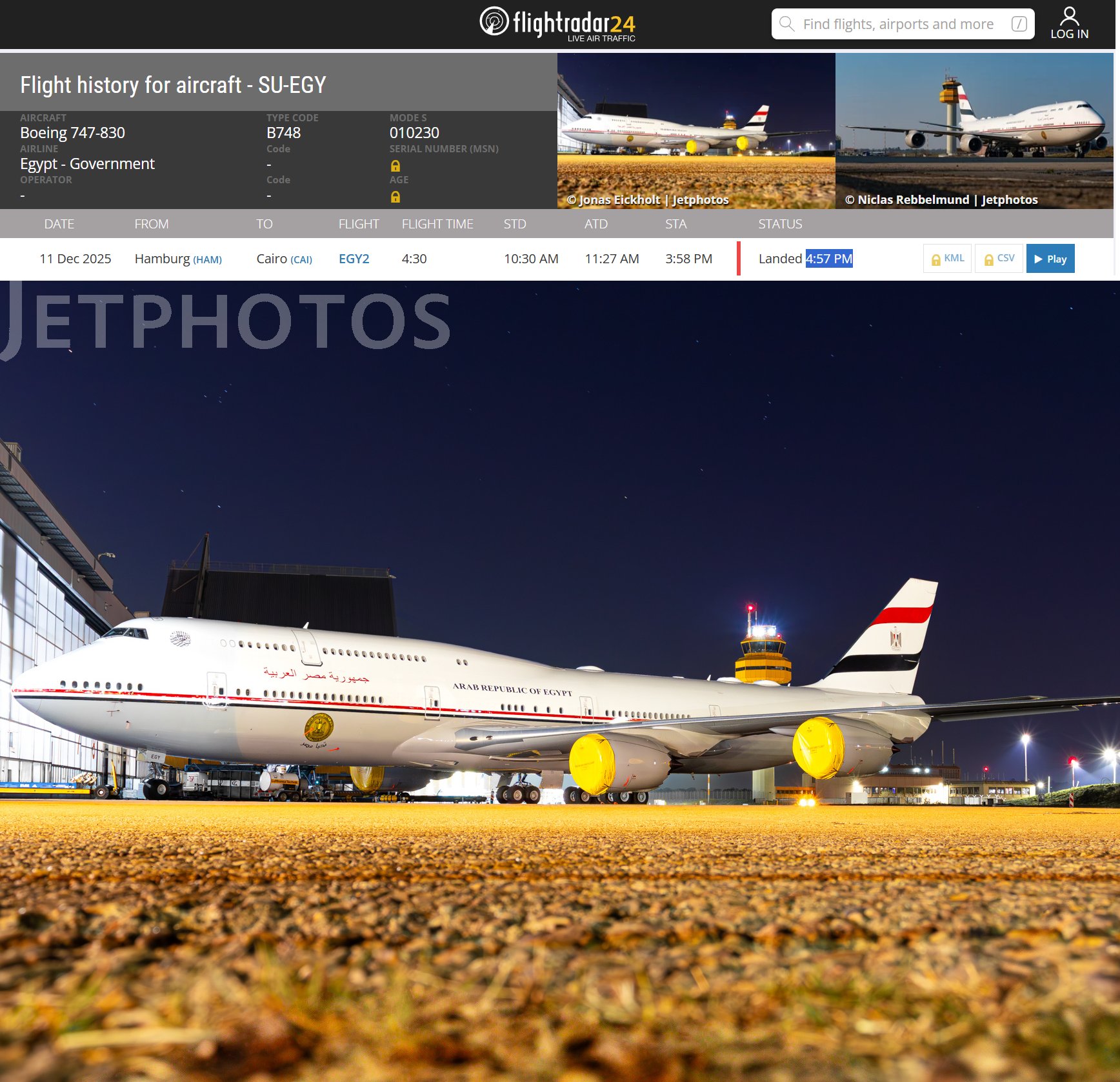وتوقفت الطائرة على الأرض لقرابة الستة أشهر في هامبورج، ثم حلّقت طائرة الرئاسة المصرية الجديدة من طراز B747-8 قبل عدة أيام فوق هامبورغ. في حين تقدر قيمة هذه الطائرة بنصف مليار دولار، ولكن أحد النواب المصريين أكد أن تكلفتها كانت 240 مليون دولار فقط.