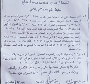 الوثيقة التي ظهرتها في الصورة هي إشعار رسمي صادر عن: شركة مياه الشرب والصرف الصحي بالجنوب – الهيئة القومية لمياه الشرب والصرف الصحي – وزارة الإسكان والمرافق والمجتمعات العمرانية.