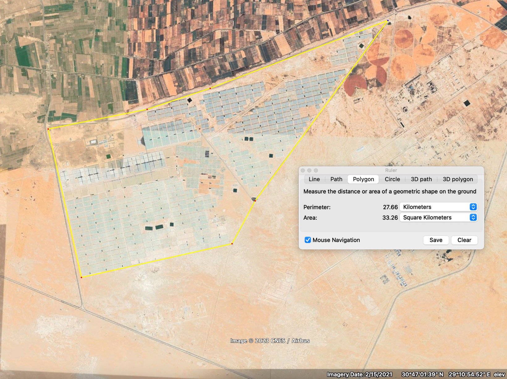 وفي افتتاح مشروع الصوب الزراعية بقاعدة محمد نجيب ذكر السيسي أن مساحة الصوب المبنية هى 16 ألف فدان. لكن صورة الموقع من جوجل إيرث أظهرت أن المساحة المغطاة هي 7 آلاف فدان فقط، واستعرض إعلام الانقلاب ومنهم أحمد موسى صوبة أو اثنين فقط لزوم اللقطة.