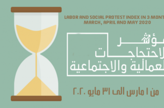 رصد مؤشر الاحتجاجات العمالية والاجتماعية، الصادر عن الشبكة العربية لمعلومات حقوق الإنسان خلال 3 شهور، مارس وأبريل ومايو 2020، 74 احتجاجًا من بينها 40 احتجاجًا عماليًا ومهنيًا، و34 ...