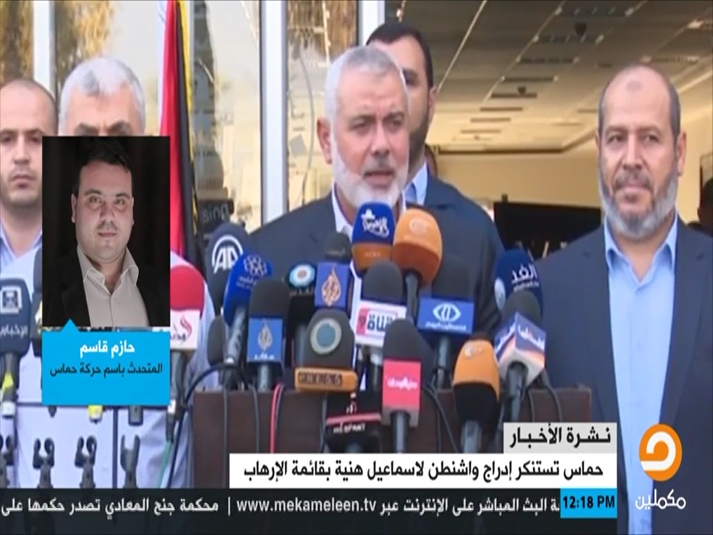 قال حازم قاسم، المتحدث باسم حركة حماس، إن إدراج الإدارة الأمريكية إسماعيل هنية، رئيس المكتب السياسي للحركة، بقوائم الإرهاب محاولة فاشلة للضغط على الحركة للقبول بصفقة القرن. وأضاف ...