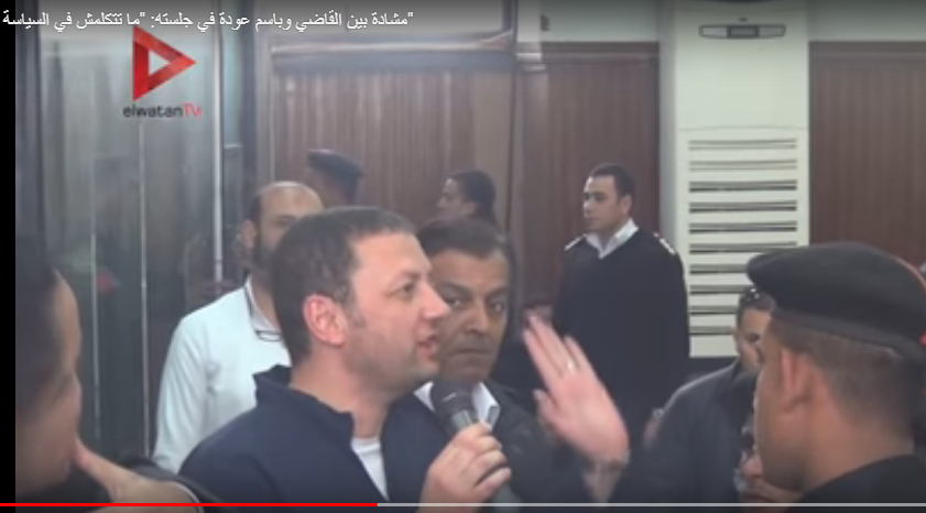 انفعل الدكتور باسم عودة، وزير التموين في حكومة الثورة، على الانقلابي حسن فريد، قاضي هزلية فض رابعة، بعد محاولة الأخير وضع شروط للسماح له بالتحدث. وفي بداية حديث ...