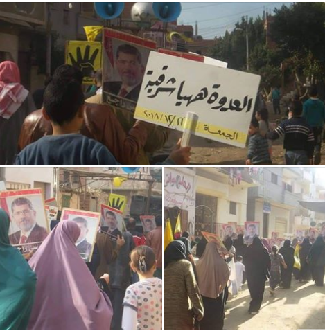 تقدم عدد من أسر المعتقلين والشهداء المظاهرة التي انطلقت عقب صلاة الجمعة من قرية العدوة، مسقط رأس الرئيس محمد مرسى التابعة لمركز ههيا في الشرقية، تندد بجرائم العسكر ...